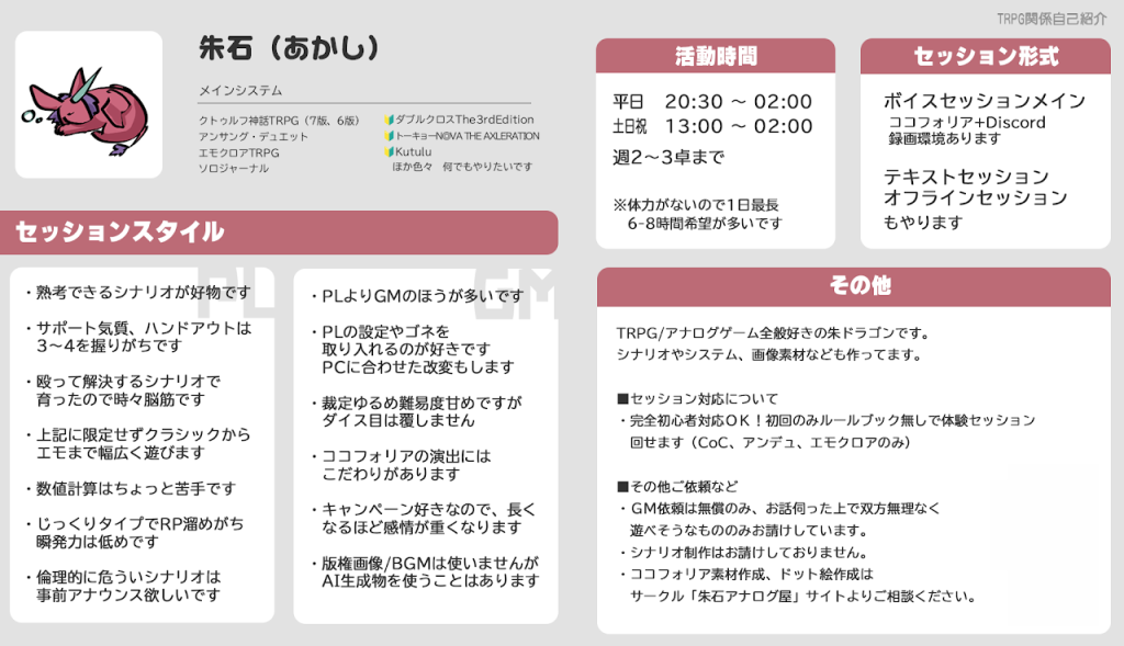 身内卓中心、野良ではほぼGMで活動中です。平日は20時半頃~2時頃まで、休祝日は13時~2時頃まで。